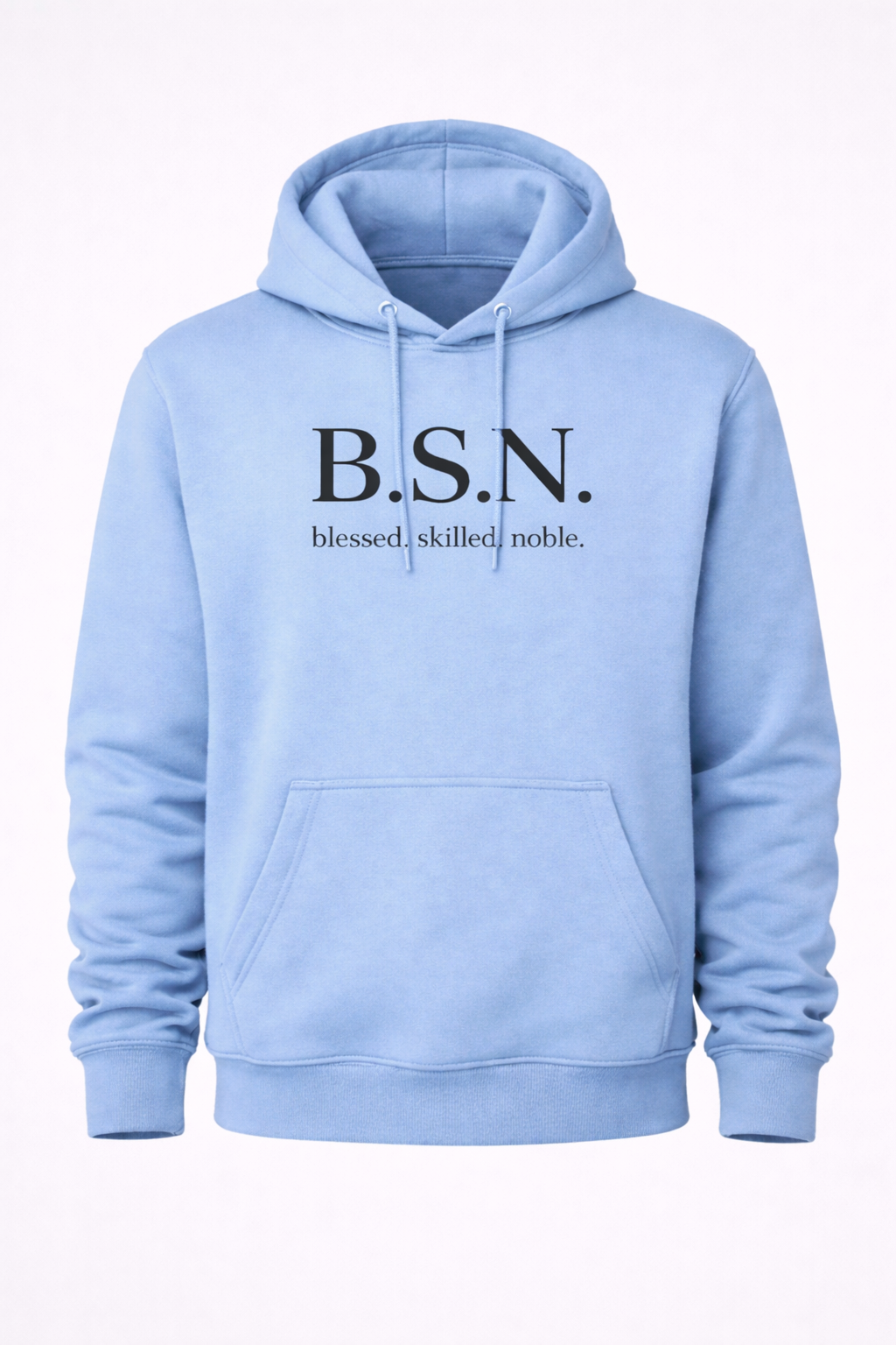 Warm, uplifting, and full of purpose, the BSN Hoodie celebrates the faith, excellence, and integrity behind every Bachelor-prepared nurse. Designed in a light blue tone with bold black minimalist lettering, this piece reflects grace, confidence, and calling.