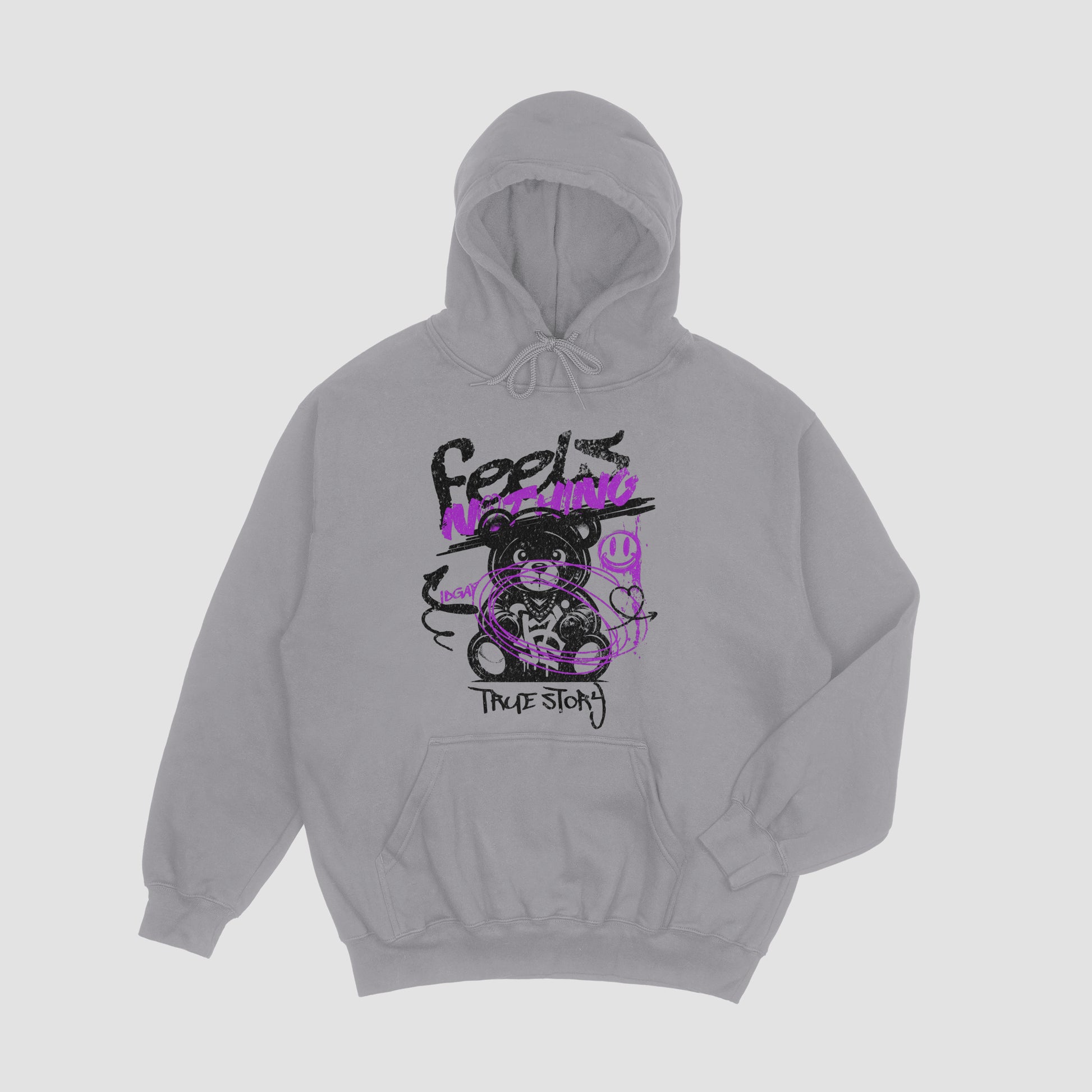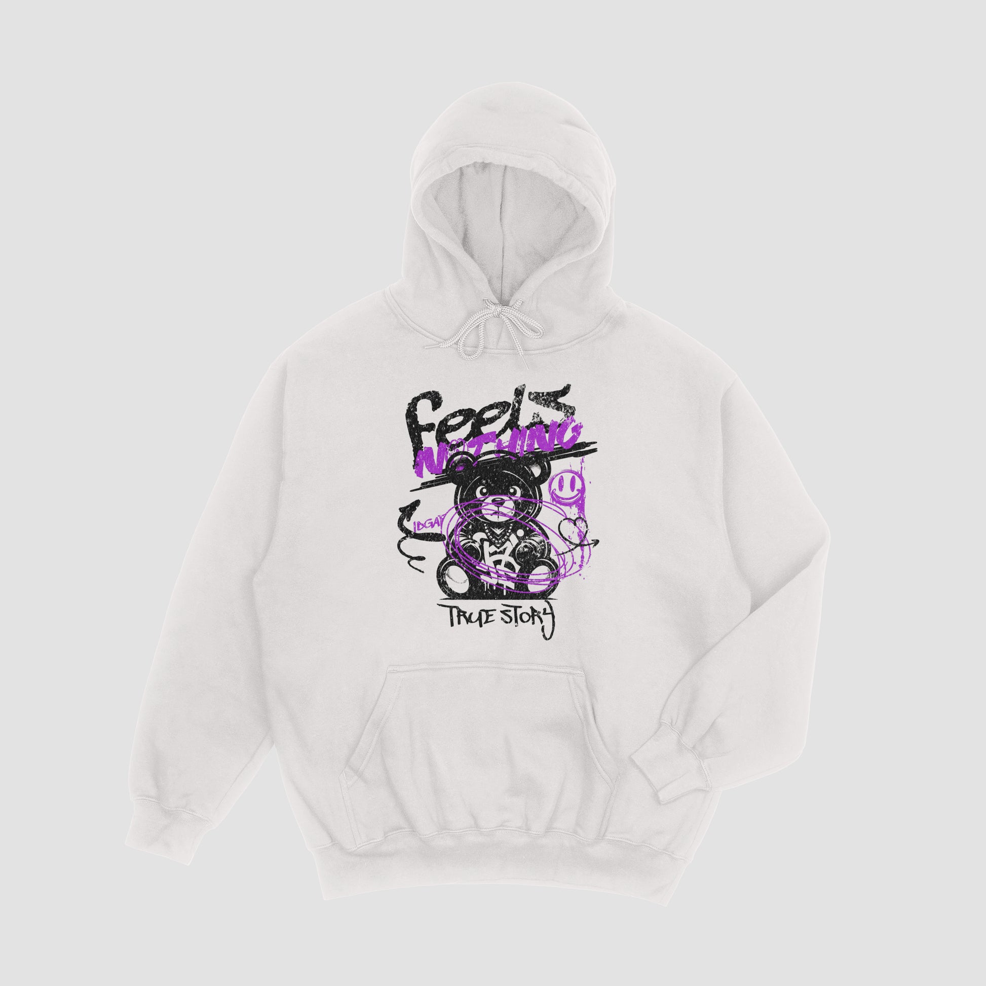The Feels Nothing Hoodie blends raw emotion with streetwear edge, featuring a distressed graphic of a bear outlined in bold black and electric purple graffiti strokes.