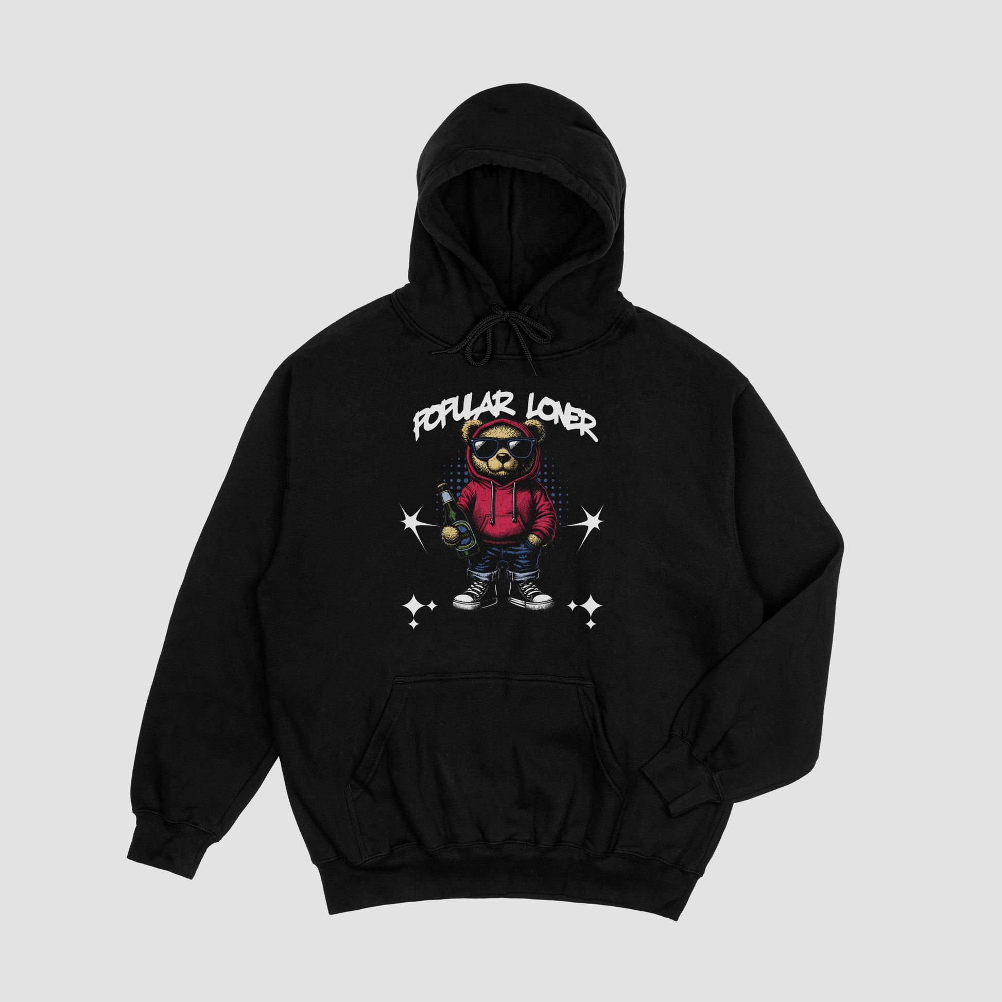 The Popular Loner Hoodie is made for those who thrive in their own lane. Featuring a bold graphic of a swagged-out bear in shades, a red hoodie, jeans, and sneakers holding a bottle, this design embodies confidence, independence, and quiet flex energy.
